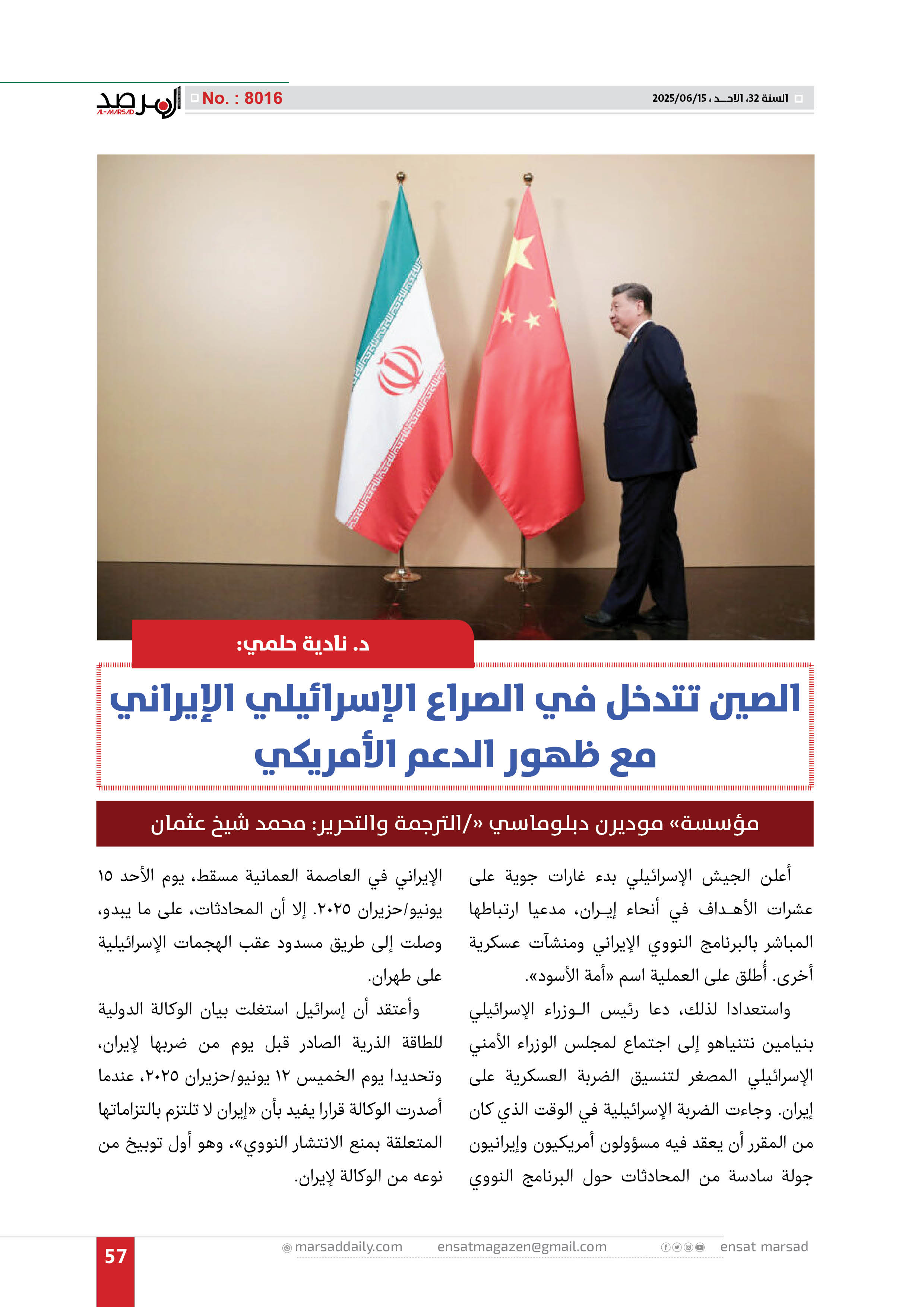 موديرن دبلوماسي :الصين تتدخل في الصراع الإسرائيلي الإيراني مع ظهور الدعم الأمريكي