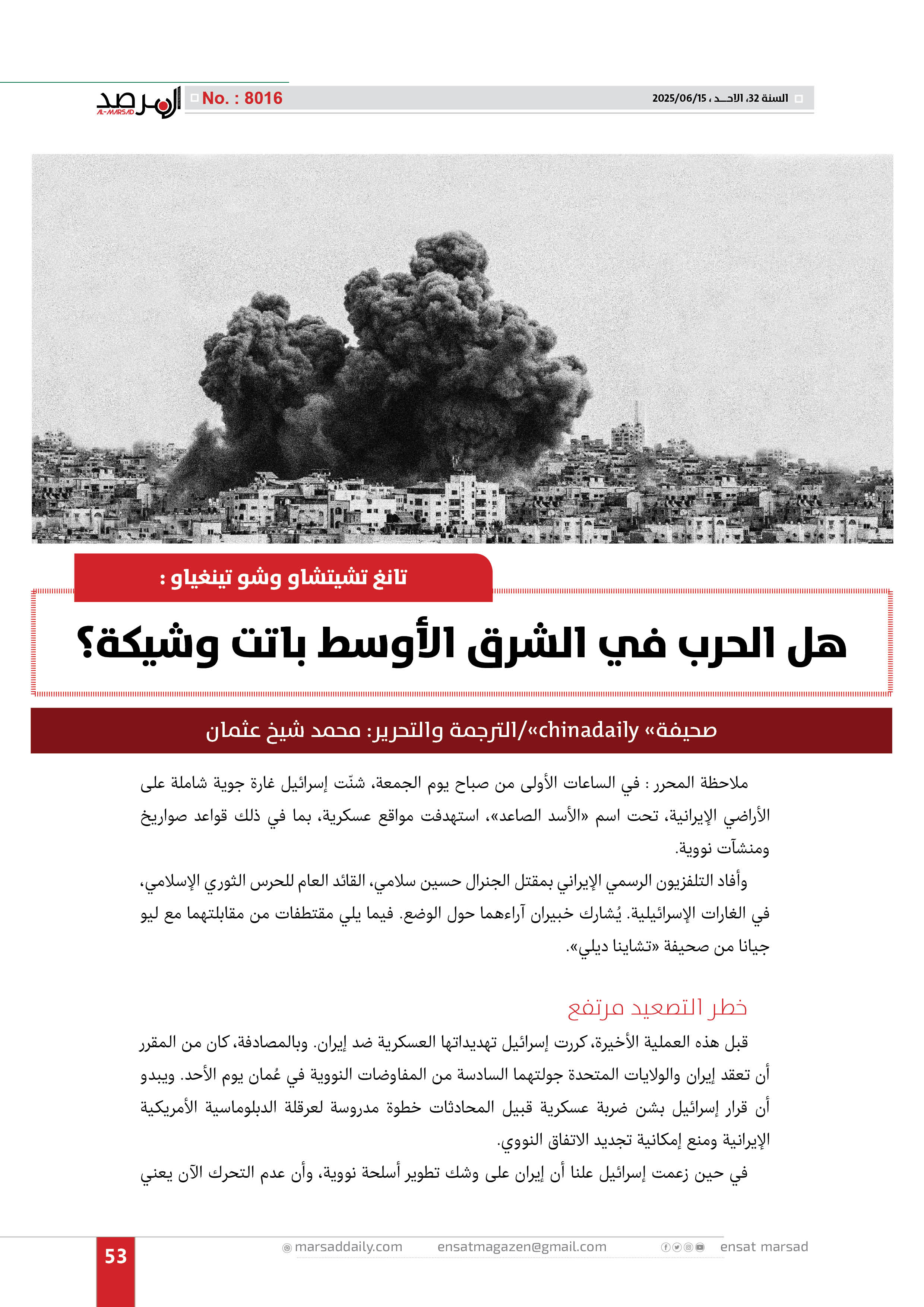 ملاحظة المحرر : في الساعات الأولى من صباح يوم الجمعة، شنّت إسرائيل غارة جوية شاملة على الأراضي الإيرانية، تحت اسم "الأسد الصاعد"، استهدفت مواقع عسكرية، بما في ذلك قواعد صواريخ ومنشآت نووية.