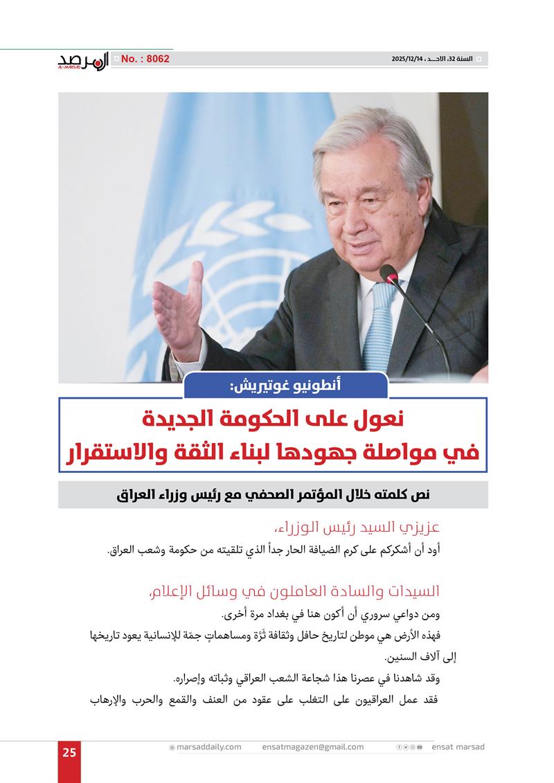 غوتيريش: نعول على الحكومة الجديدة في مواصلة جهودها لبناء الثقة والاستقرار
