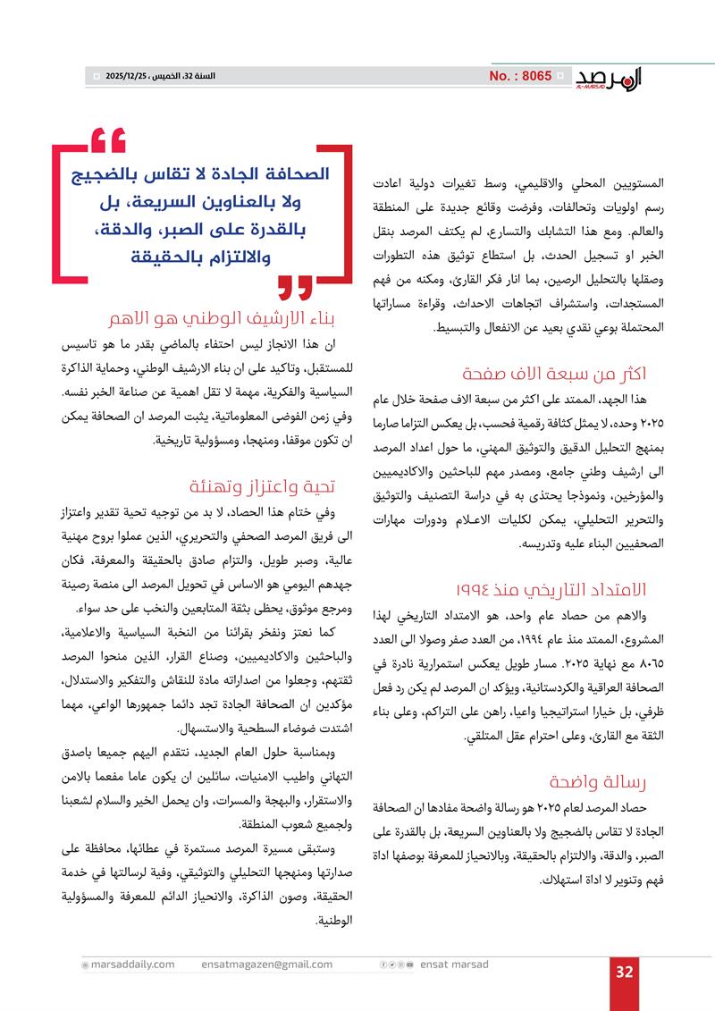 رئيس التحرير : حصاد المرصد للعام ٢٠٢٥…رسائل ودلالات