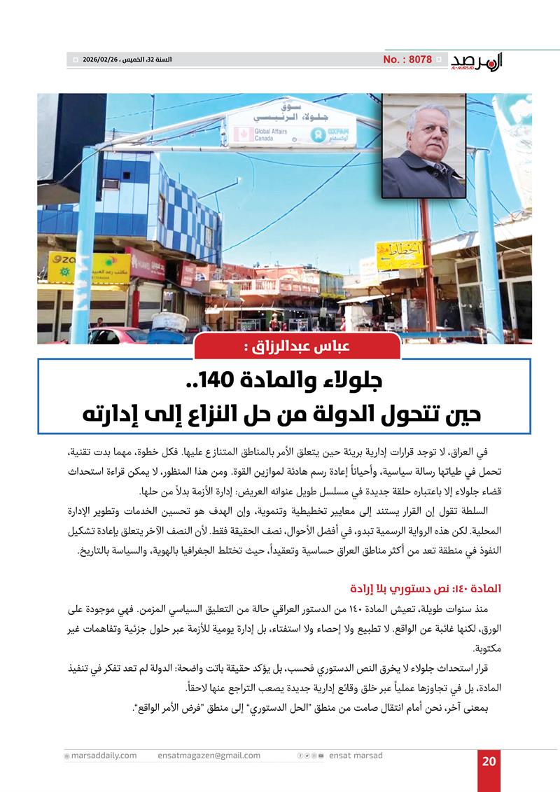 عباس عبدالرزاق : جلولاء والمادة 140.. حين تتحول الدولة من حل النزاع إلى إدارته
