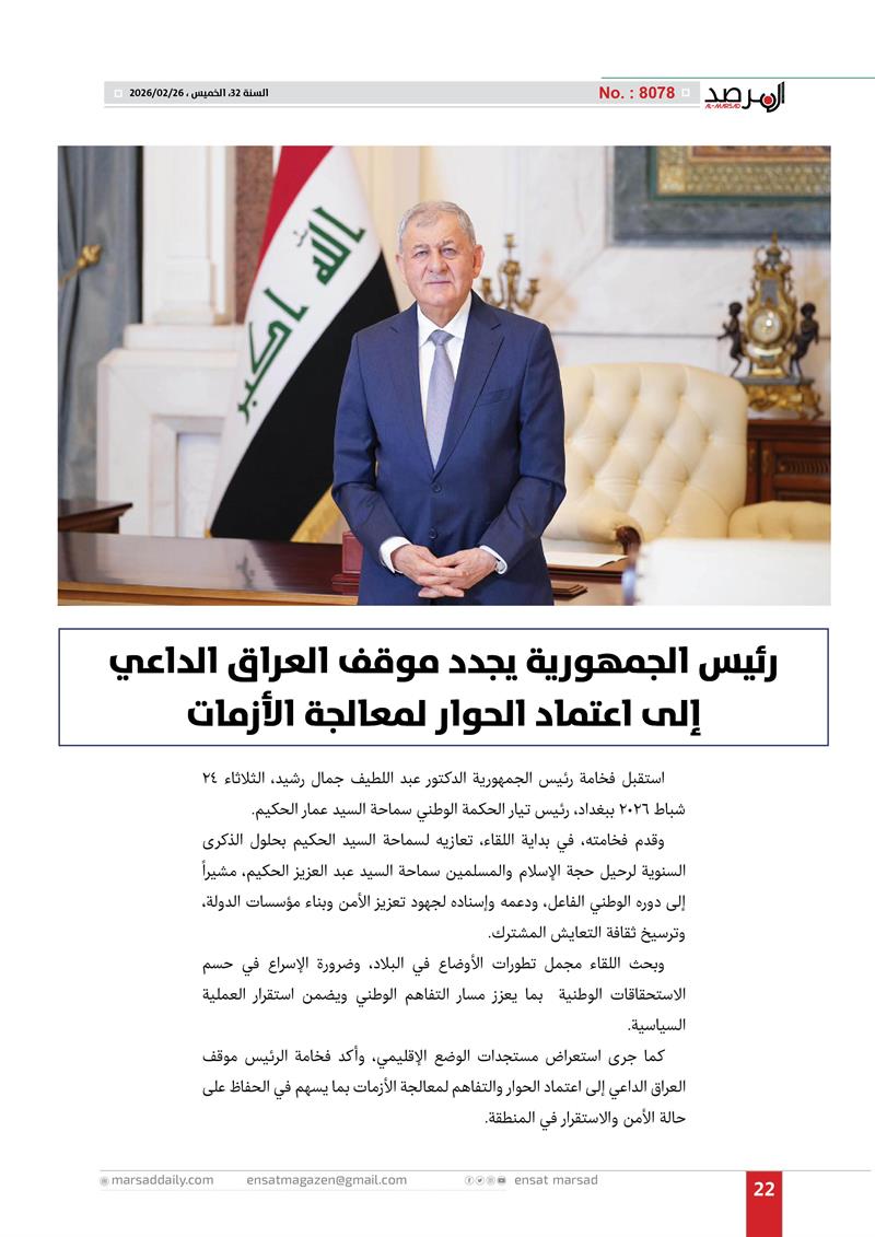 رئيس الجمهورية يجدد موقف العراق الداعي إلى اعتماد الحوار لمعالجة الأزمات