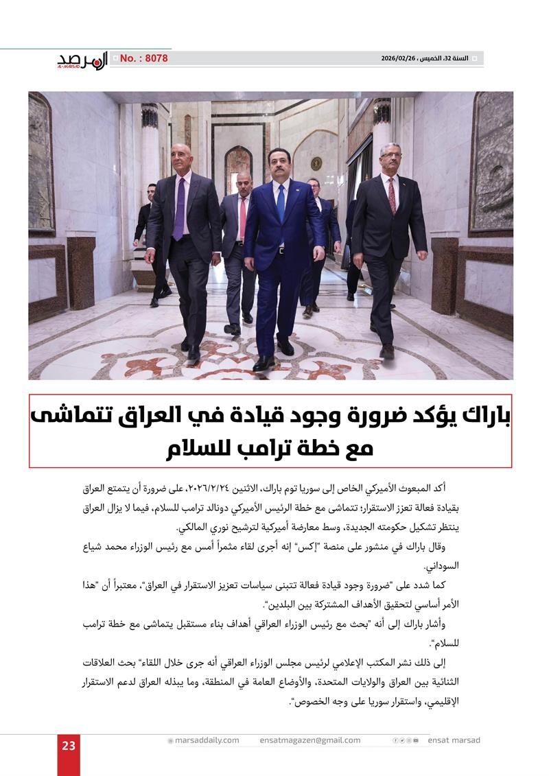 باراك يؤكد ضرورة وجود قيادة في العراق تتماشى مع خطة ترامب للسلام
