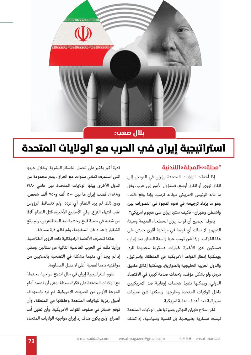 مجلة لندنية: استراتيجية إيران في الحرب مع الولايات المتحدة