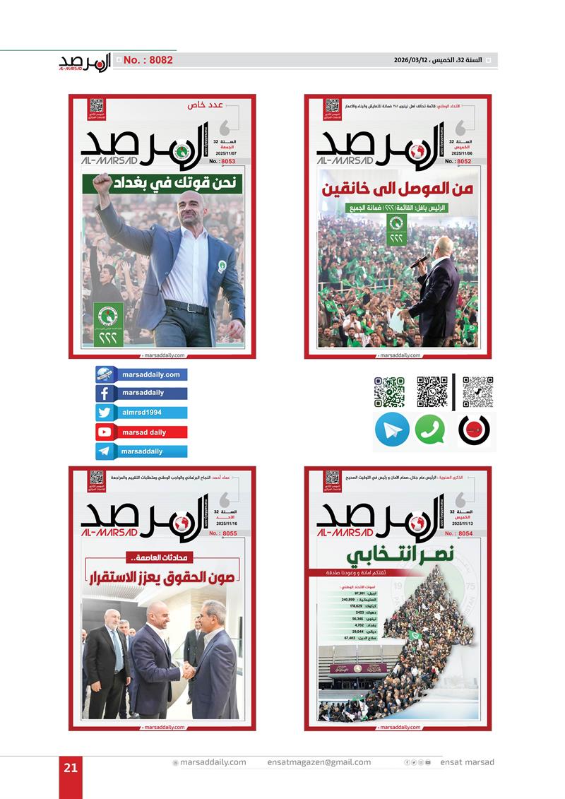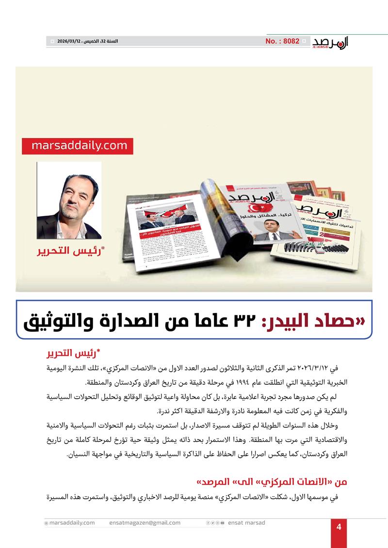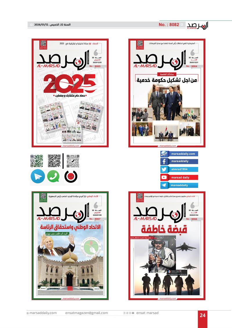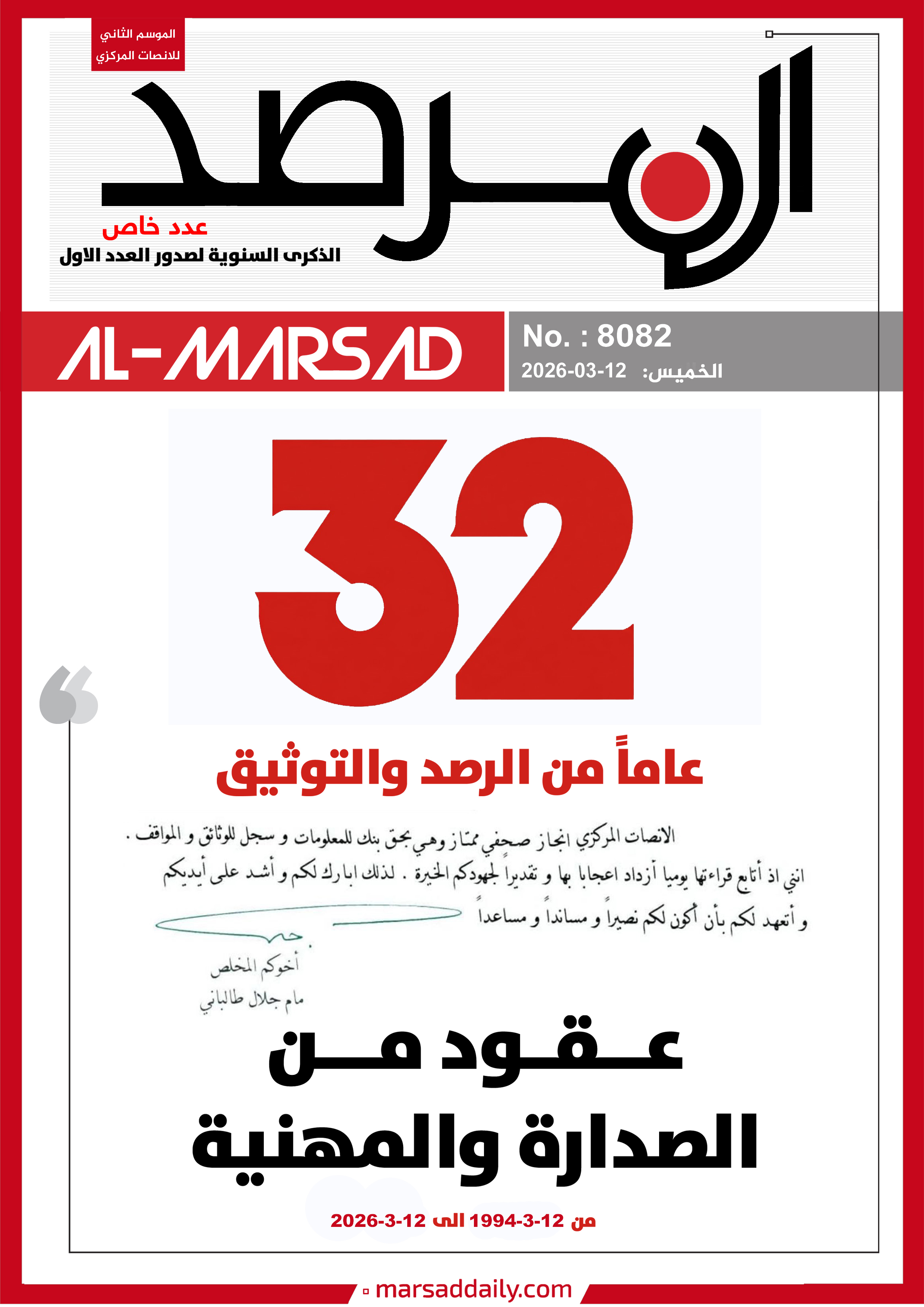 اليوم وقد اكتمل العام الـ(32) من عمر الموسوعة التحليلية التي بدات مسيرتها في 12/3/1994 لتصل عددها الى (8082) وفي هذا العدد الخاص وضعنا الغلاف الاول لكل عدد تم اصداره خلال العام الـ(32) وعناوين منصاتنا على شبكة الانترنت (marsaddaily.com) و على منصات التواصل الاجتماعي كواجهة الكترونية لمجلتنا الورقية .