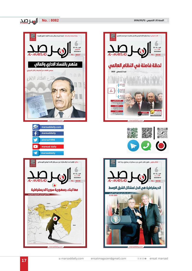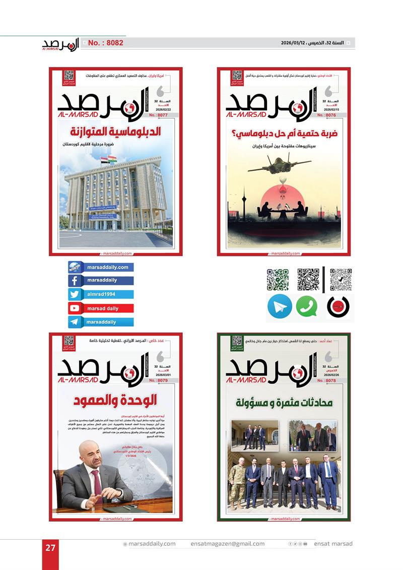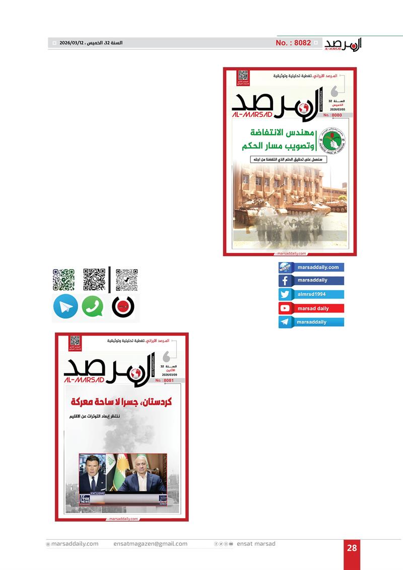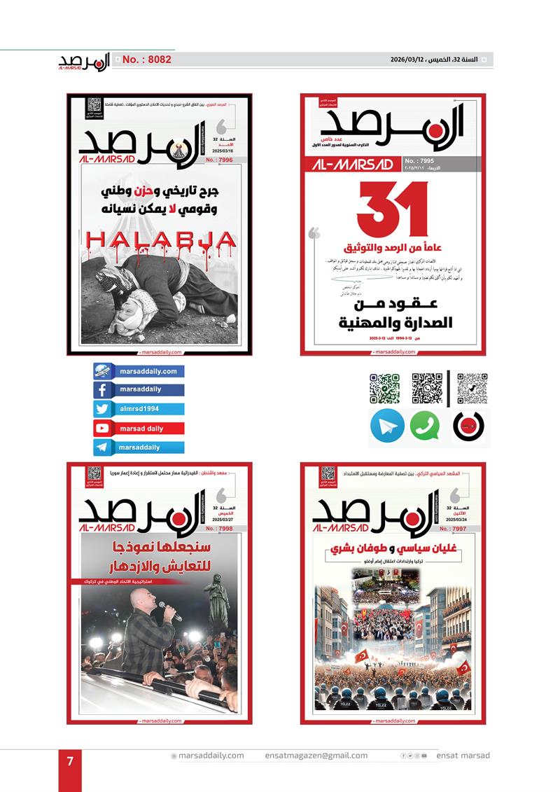 اليوم وقد اكتمل العام الـ(32) من عمر الموسوعة التحليلية التي بدات مسيرتها في 12/3/1994 لتصل عددها الى (8082) وفي هذا العدد الخاص وضعنا الغلاف الاول لكل عدد تم اصداره خلال العام الـ(32) وعناوين منصاتنا على شبكة الانترنت (marsaddaily.com) و على منصات التواصل الاجتماعي كواجهة الكترونية لمجلتنا الورقية .