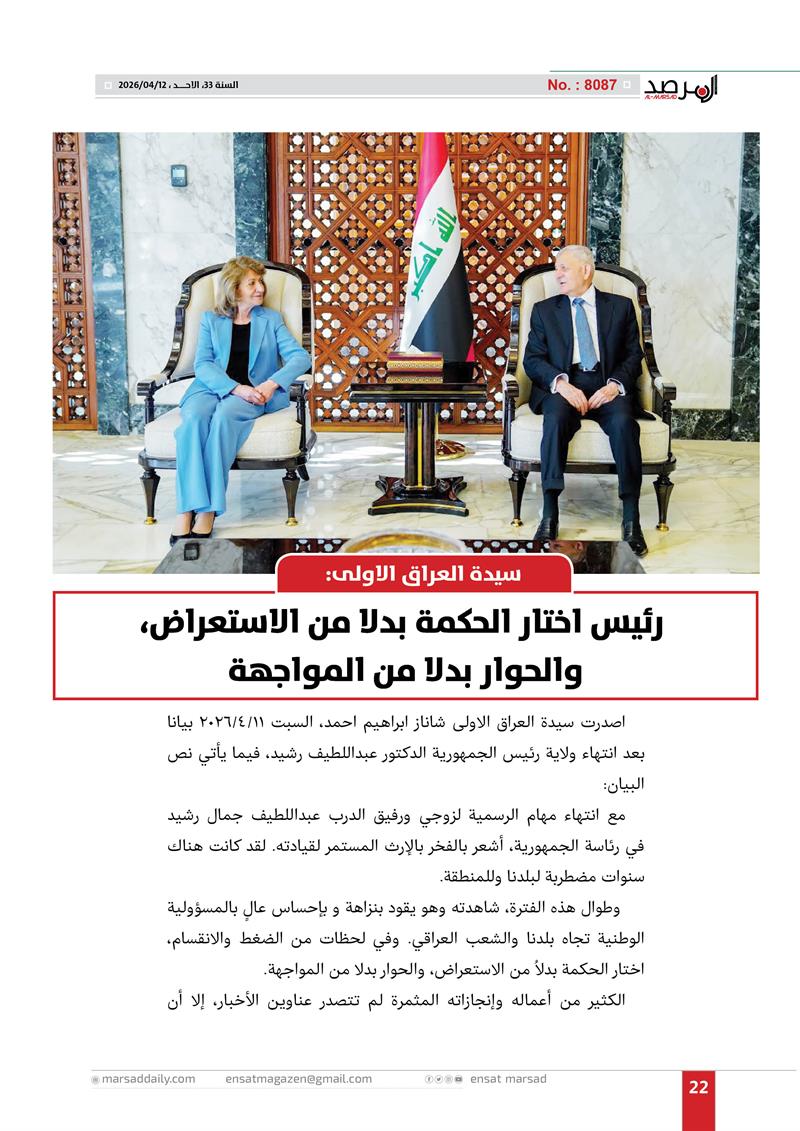 سيدة العراق الاولى: رئيس اختار الحكمة بدلا من الاستعراض