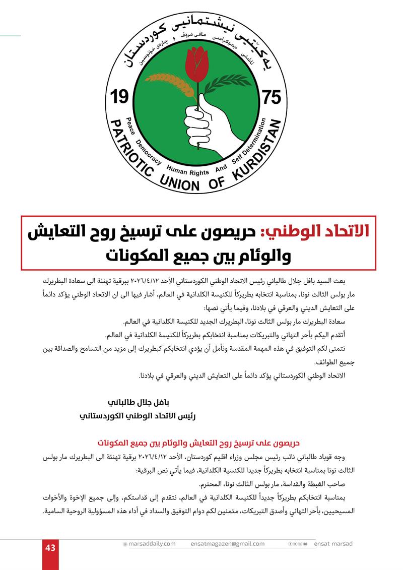الاتحاد الوطني: حريصون على ترسيخ روح التعايش والوئام بين جميع المكونات
