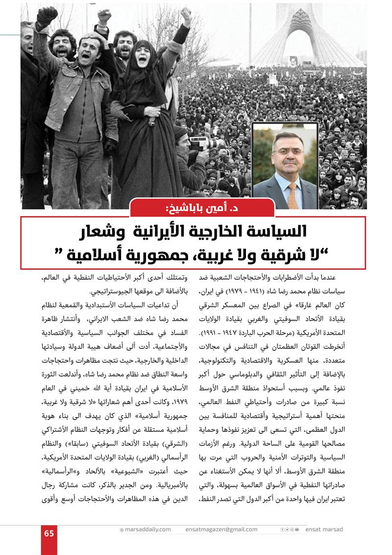 د. أمين باباشيخ: السياسة الخارجية الأيرانية وشعار ”لا شرقية ولا غربية،
