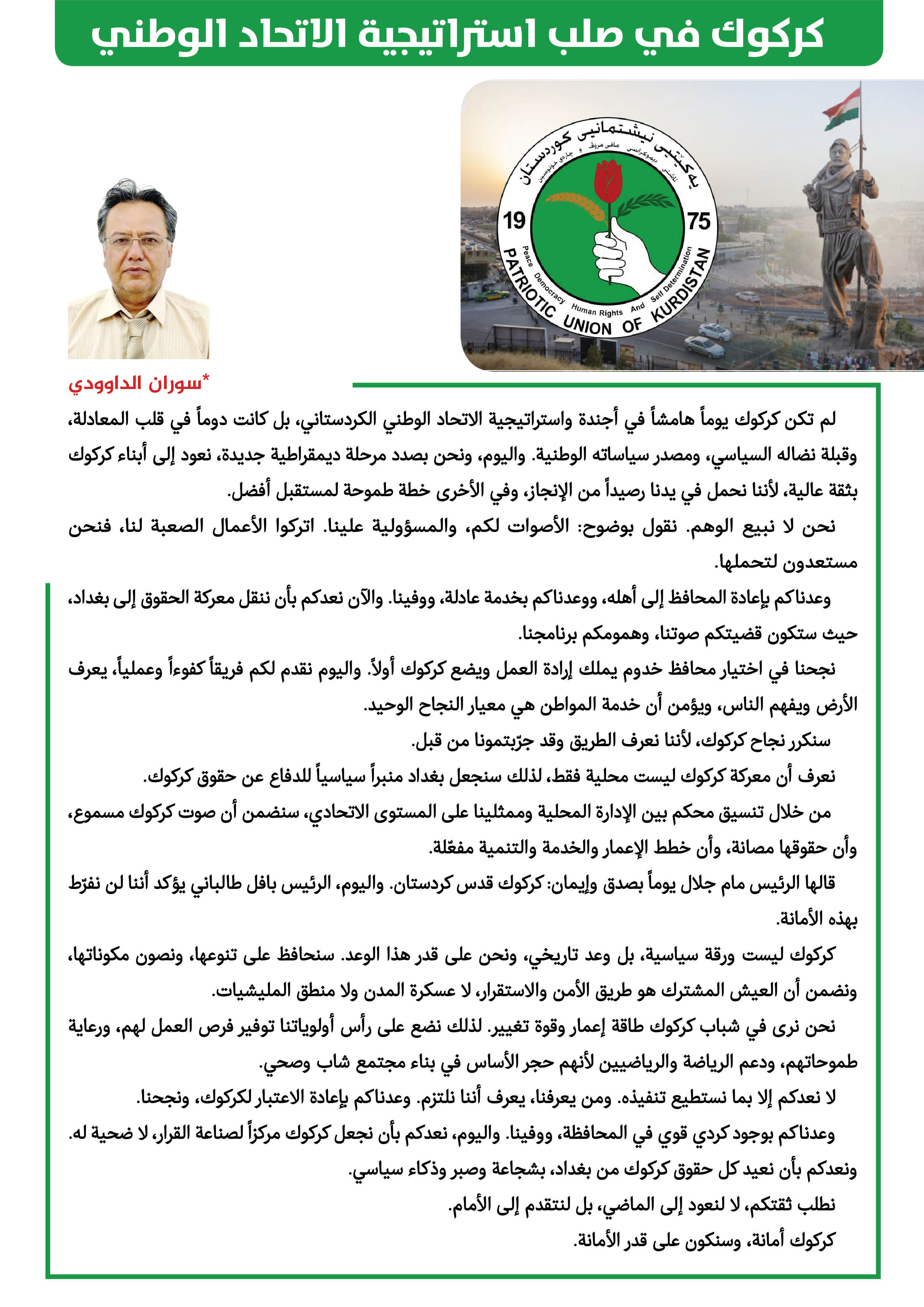 لم تكن كركوك يوماً هامشاً في أجندة واستراتيجية الاتحاد الوطني الكردستاني، بل كانت دوماً في قلب المعادلة، وقبلة نضاله السياسي، ومصدر سياساته الوطنية. واليوم، ونحن بصدد مرحلة ديمقراطية جديدة، نعود إلى أبناء كركوك بثقة عالية، لأننا نحمل في يدنا رصيداً من الإنجاز، وفي الأخرى خطة طموحة لمستقبل أفضل.