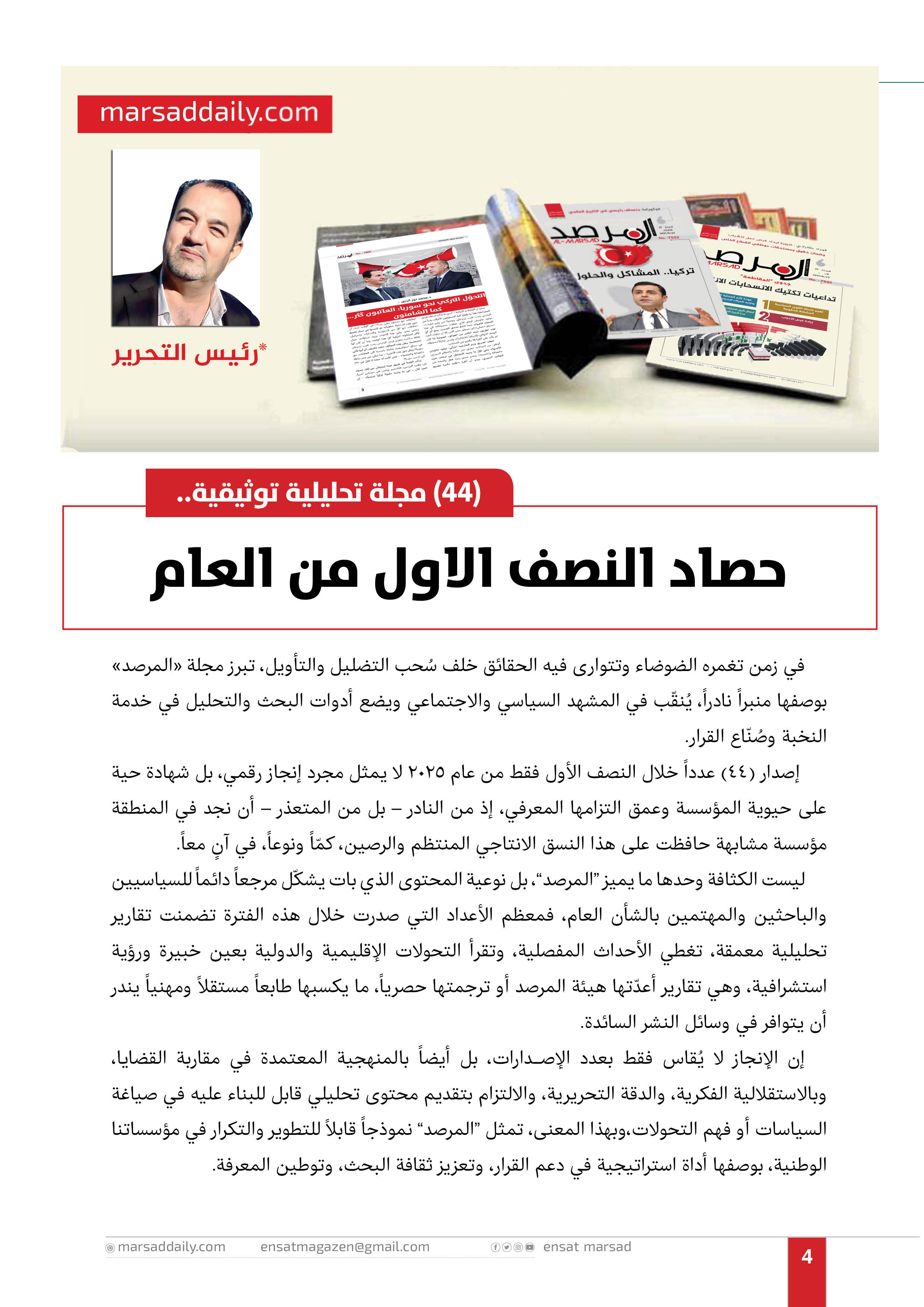 في زمن تغمره الضوضاء وتتوارى فيه الحقائق خلف سُحب التضليل والتأويل، تبرز مجلة "المرصد" بوصفها منبراً نادراً، يُنقّب في المشهد السياسي والاجتماعي ويضع أدوات البحث والتحليل في خدمة النخبة وصُنّاع القرار.