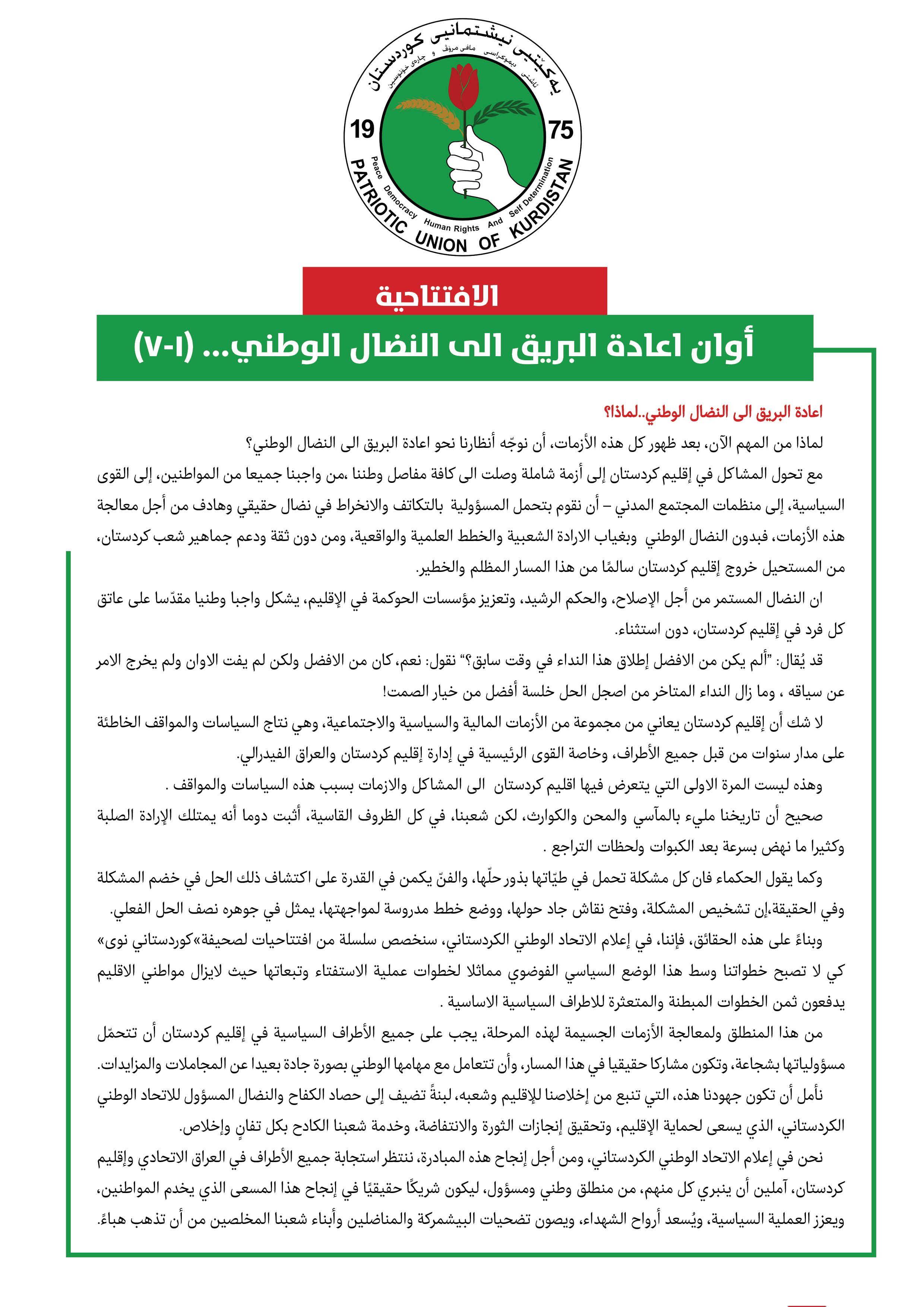 ان النضال المستمر من أجل الإصلاح، والحكم الرشيد، وتعزيز مؤسسات الحوكمة في الإقليم، يشكل واجبا وطنيا مقدّسا على عاتق كل فرد في إقليم كردستان، دون استثناء.