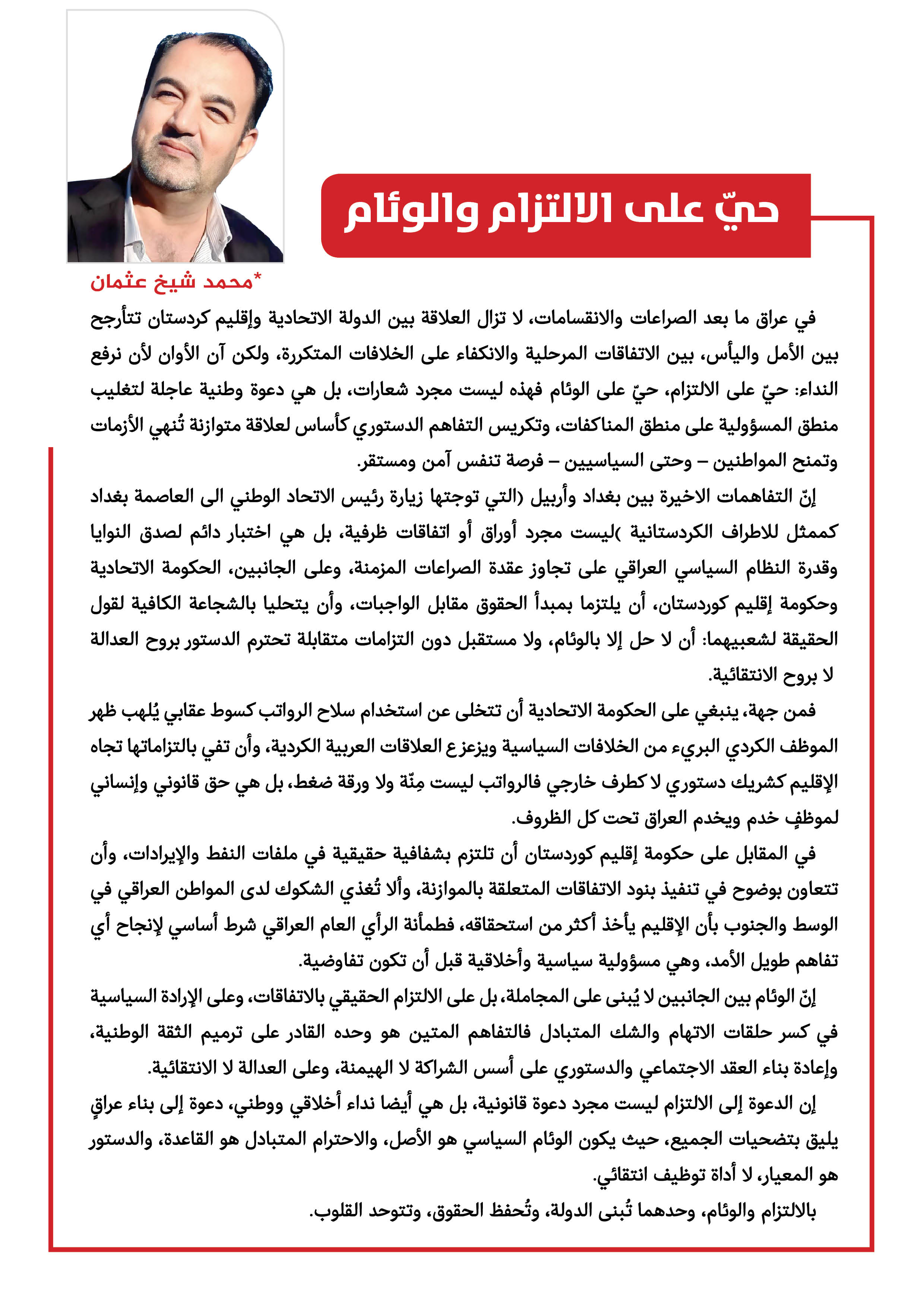 في عراق ما بعد الصراعات والانقسامات، لا تزال العلاقة بين الدولة الاتحادية وإقليم كردستان تتأرجح بين الأمل واليأس، بين الاتفاقات المرحلية والانكفاء على الخلافات المتكررة، ولكن آن الأوان لأن نرفع النداء: حيّ على الالتزام، حيّ على الوئام فهذه ليست مجرد شعارات، بل هي دعوة وطنية عاجلة لتغليب منطق المسؤولية على منطق المناكفات، وتكريس التفاهم الدستوري كأساس لعلاقة متوازنة تُنهي الأزمات وتمنح المواطنين – لا السياسيين – فرصة تنفس آمن ومستقر.