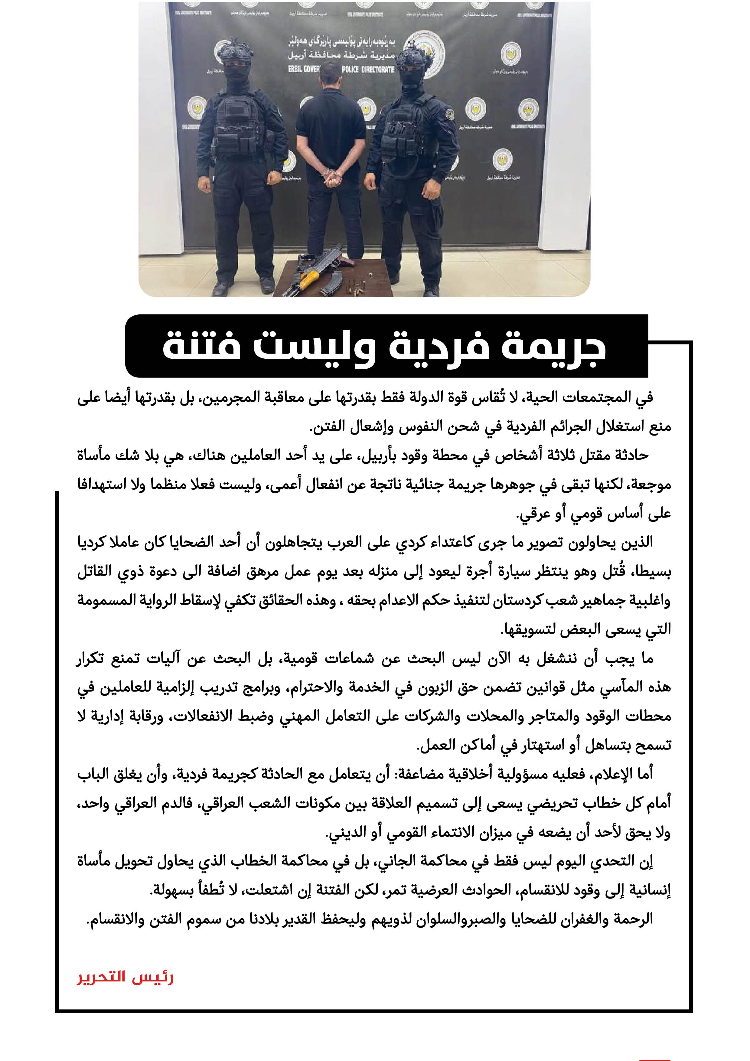 حادثة مقتل ثلاثة أشخاص في محطة وقود بأربيل، على يد أحد العاملين هناك، هي بلا شك مأساة موجعة، لكنها تبقى في جوهرها جريمة جنائية ناتجة عن انفعال أعمى، وليست فعلا منظما ولا استهدافا على أساس قومي أو عرقي.
