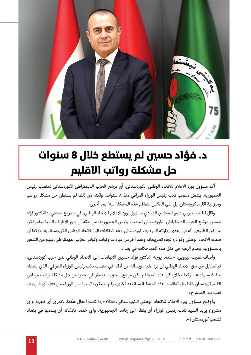 د. فؤاد حسين لم يستطع خلال 8 سنوات حل مشكلة رواتب الاقليم