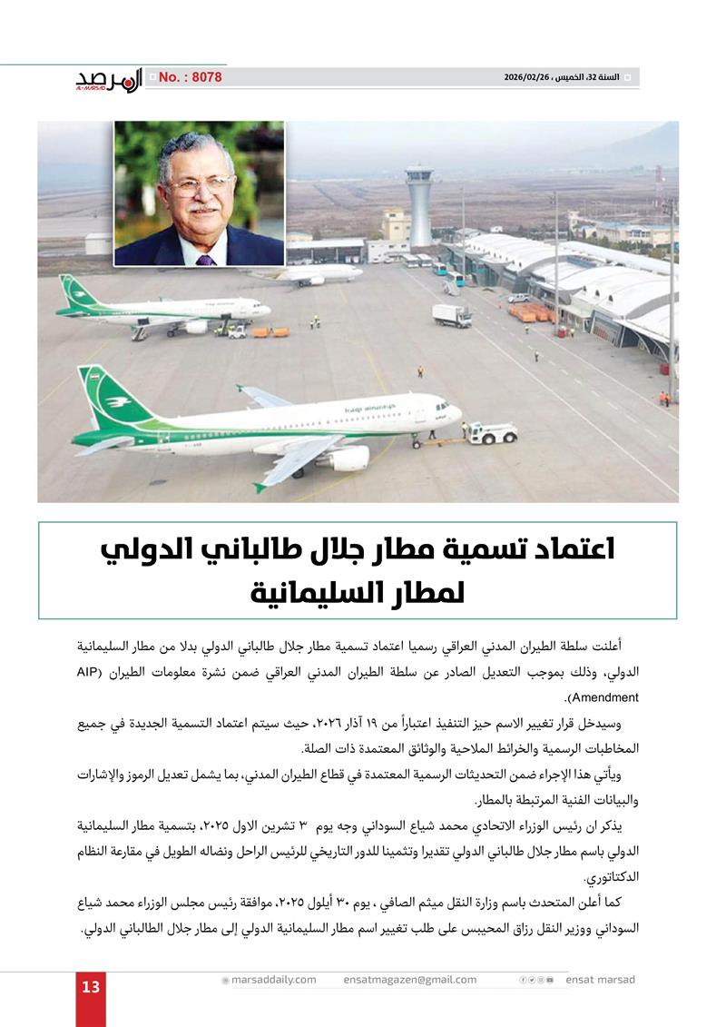 اعتماد تسمية مطار جلال طالباني الدولي لمطار السليمانية