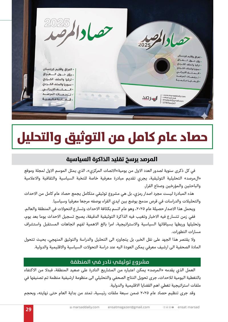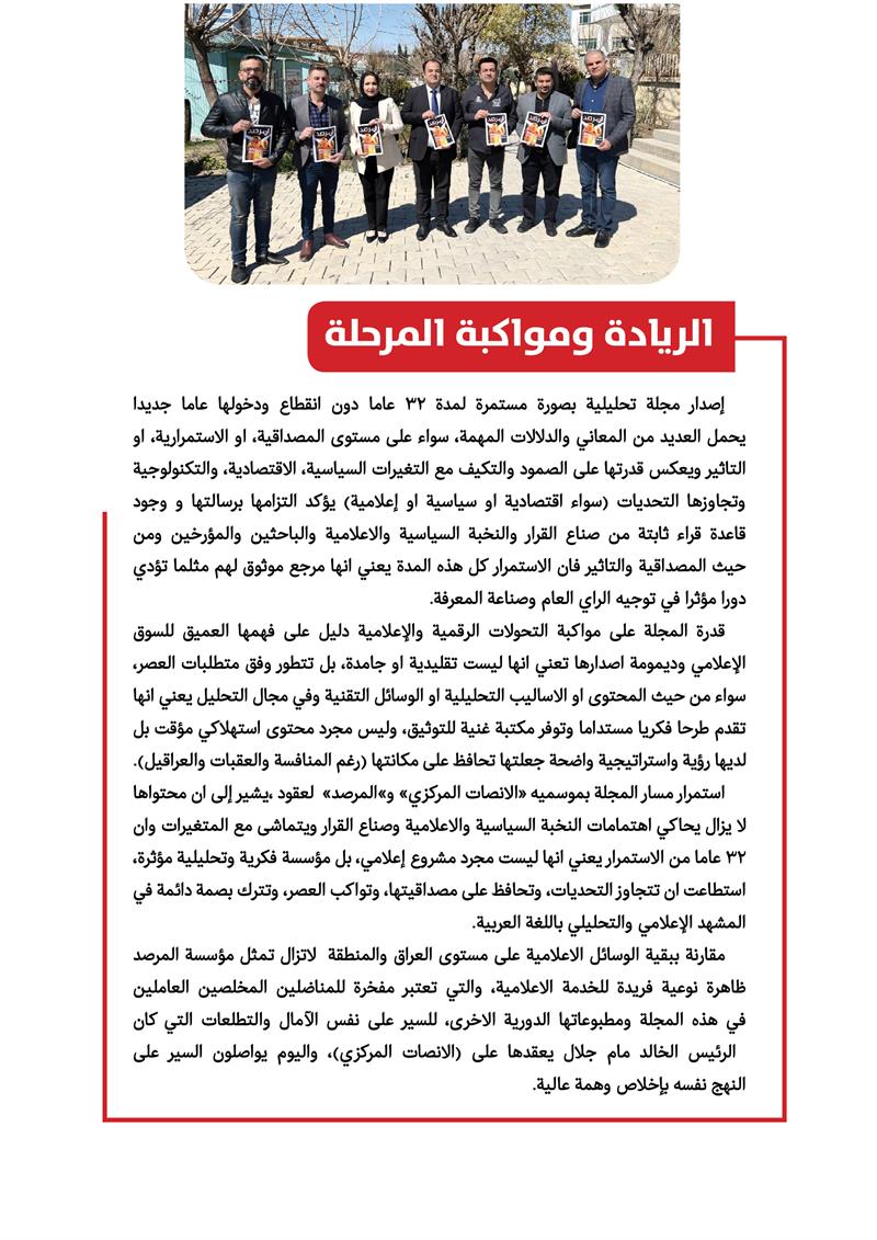 واليوم، في زمن الذكاء الاصطناعي وتدفق المعلومات، تزداد اهمية المنصات التحليلية الرصينة التي تستطيع فرز المعلومات وتقديم قراءة موثوقة وعميقة للاحداث، وهو الدور الذي تسعى مجلة "المرصد" وموقعها التحليلي الى القيام به.