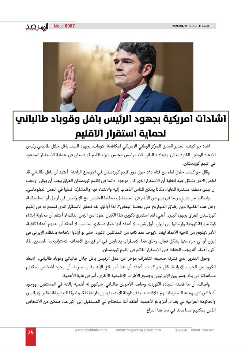 اشادات امريكية بجهود الرئيس بافل وقوباد طالباني لحماية استقرار الاقليم