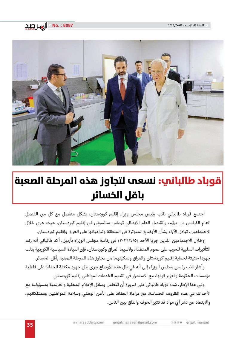 قوباد طالباني: نسعى لتجاوز هذه المرحلة الصعبة باقل الخسائر
